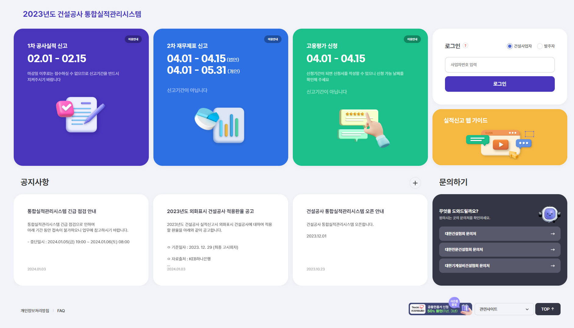 종합/전문업종 실적신고 통합시스템으로 운영