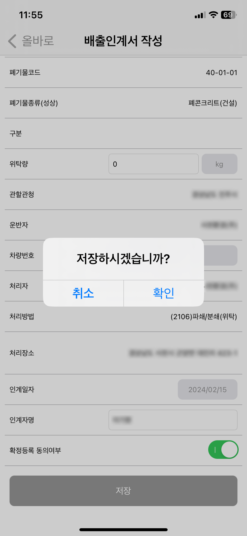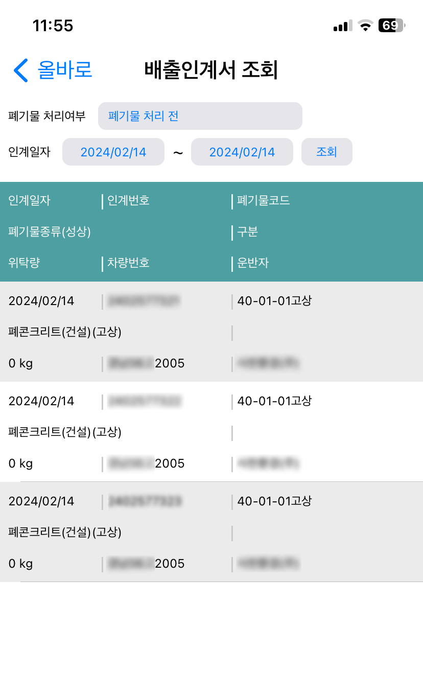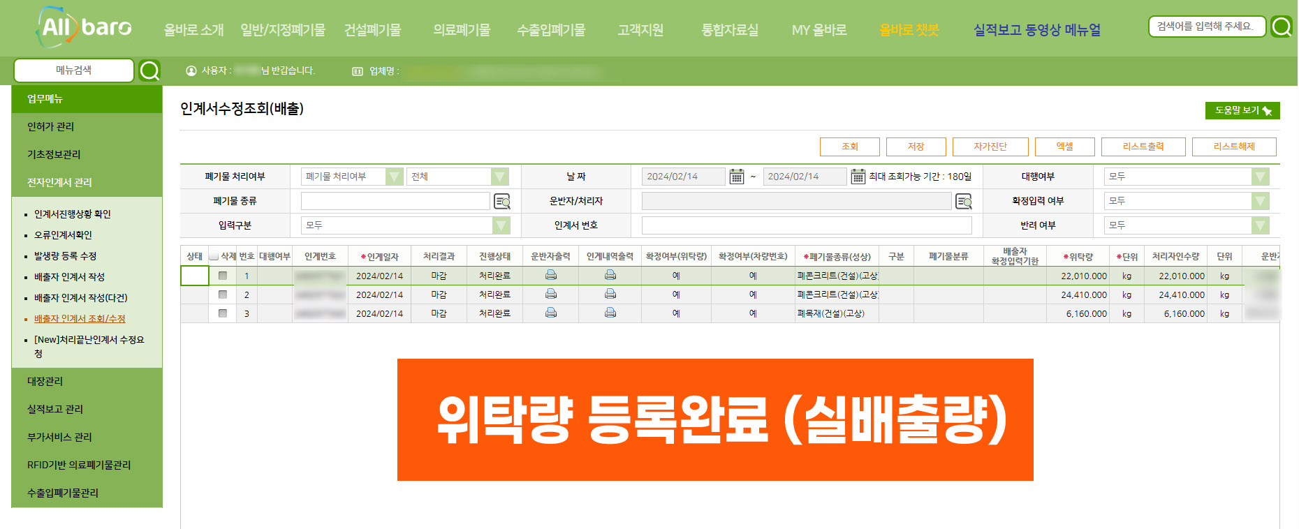 (실제로 인계서가 당일 등록이 되어야 폐기물배출 신고/등록이 가능합니다)