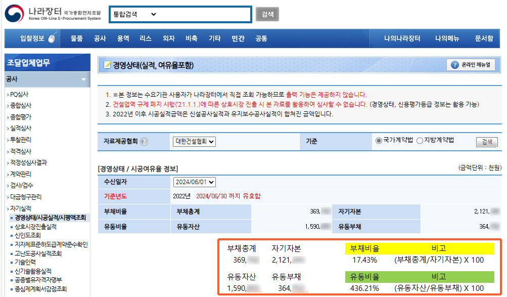 나라장터 > 공사 > 자기실적 > 경영상태/시공실적/시평액조회