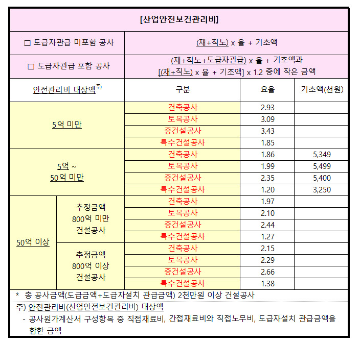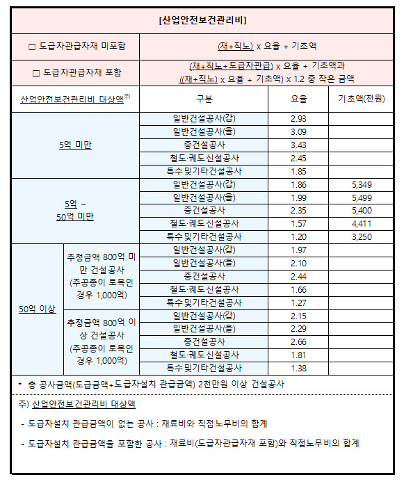 - 산재·고용보험료율 등 법정 요율은 해당 부처(국토교통부, 고용노동부 등)에 문의