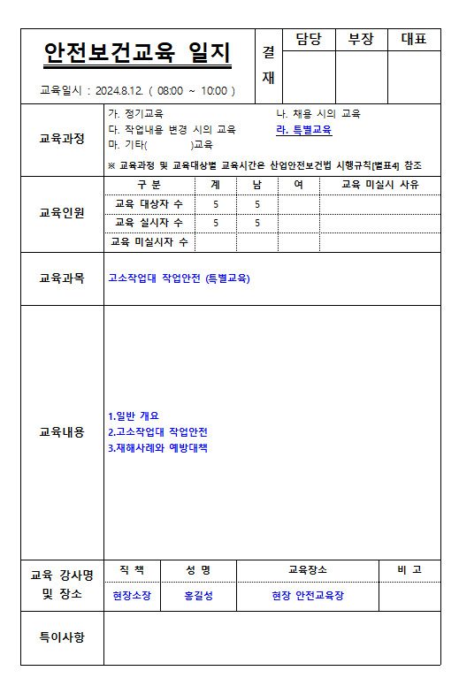 현장에서 안전교육실시 이후,