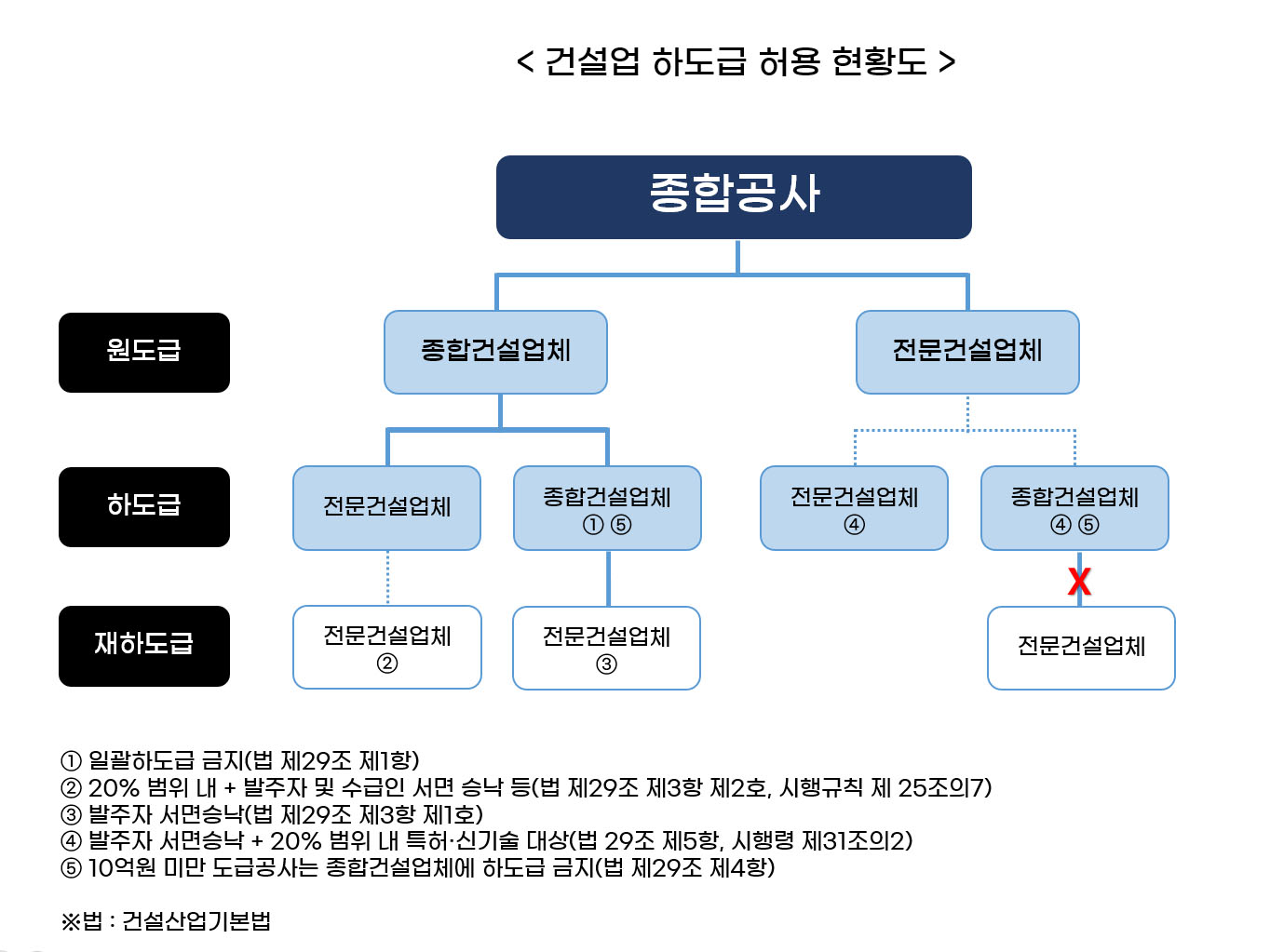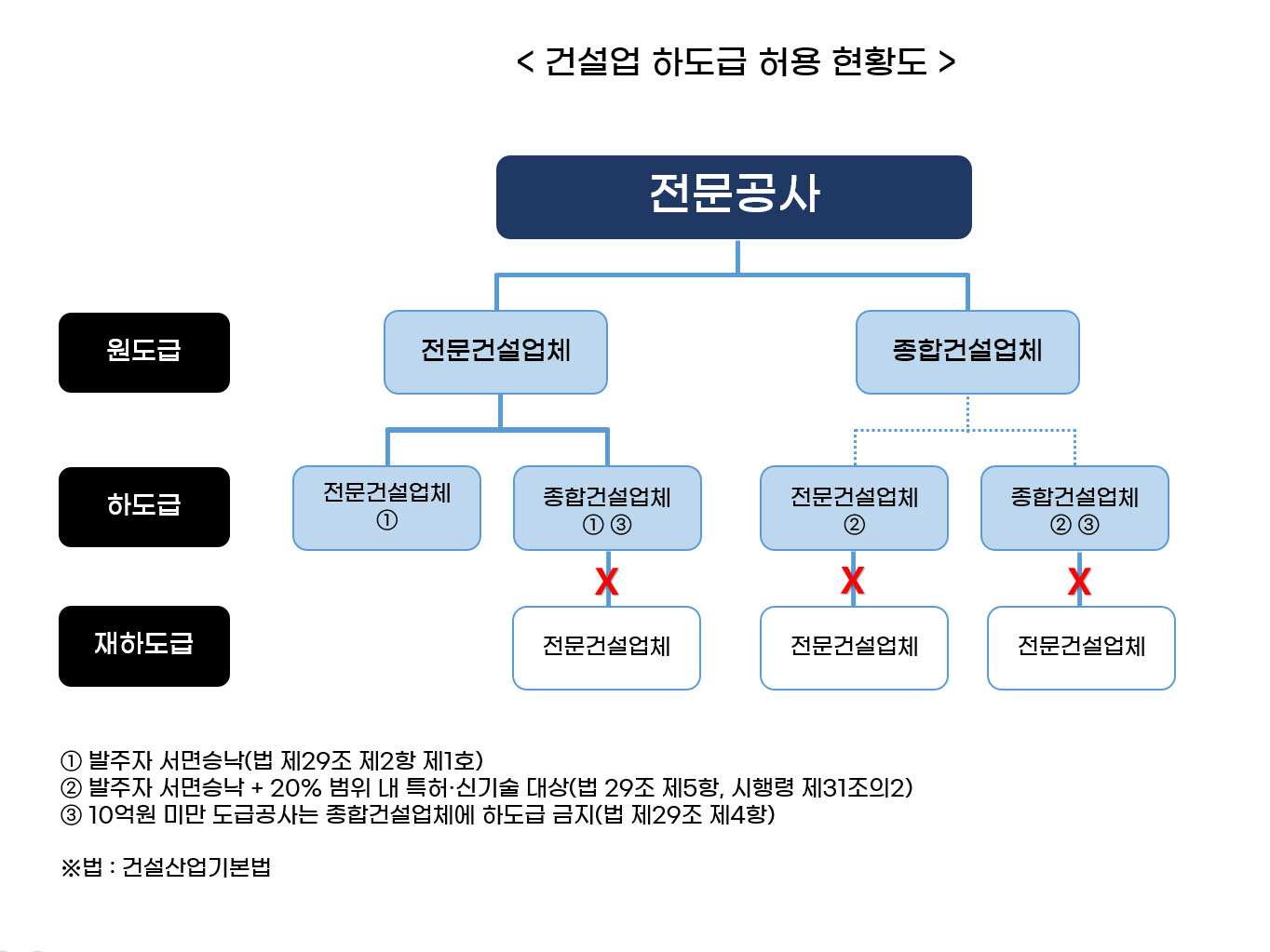 -종합건설사업자는 해당 전문공사의 원·하도급을 모두 허용하되, 총 공사금액 10억원 미만공사의 종합건설사업자 하도급 금지(건설산업기본법 제29조제4항)