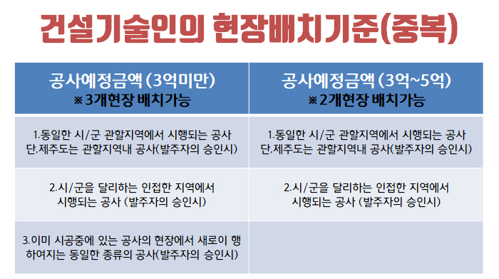 1.(추정가격 + 부가세 + 관급자재대포함) 5억원 이상 = 1인 1현장(배치가능)
