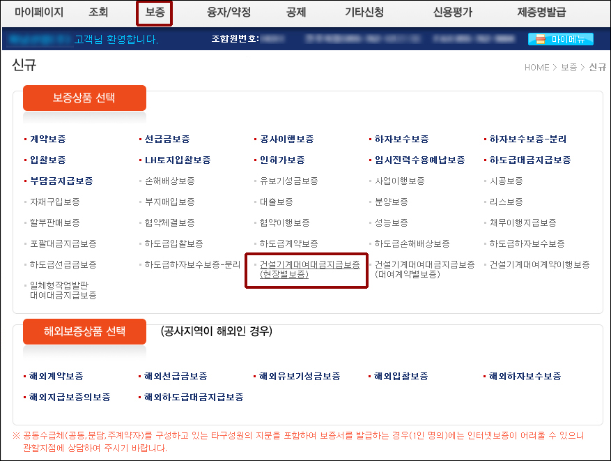건설공제조합 홈페이지 > 인터넷 창구 > 보증 > 신규 > 건설기계대여대금지급보증(현장별보증)