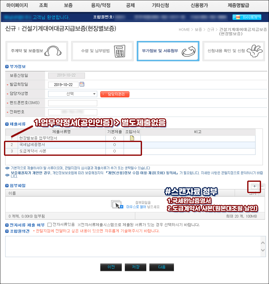 첫번째, 도급계약서+국세완납증명서로 [현장별보증서] 발급
