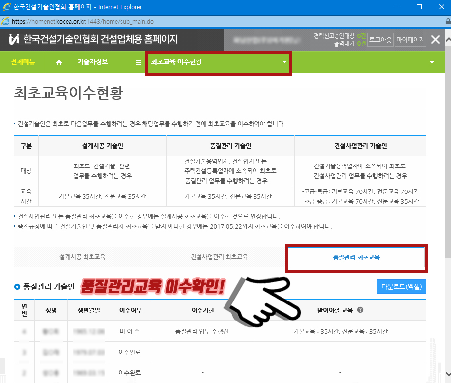 기술자정보 > 최초교육 이수현황 > 품질관리 최초교육에서 확인 할 수 있습니다.