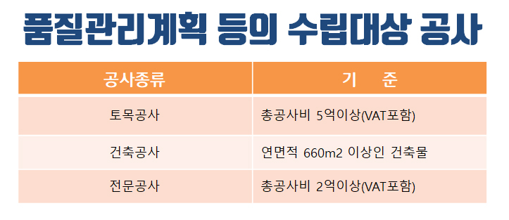 | 대 상 | -감독 권한 대행 건설사업관리 대상인 건설공사로 총 공사비 500억원이상 인 건설공사 -다중이용건축물의 건설공사로서 연면적이 3만M2 이상인 건축물의 건축공사 -해당 건설공사의 계약에 품질관리계획의 수립이 명시되어 있는 건설공사 |