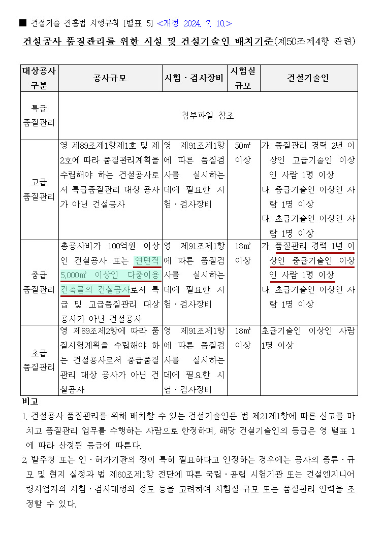 [별표 5] 건설공사 품질관리를 위한 시설 및 건설기술인 배치기준(제50조제4항 관련)