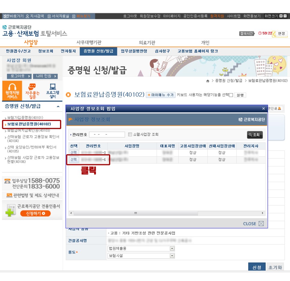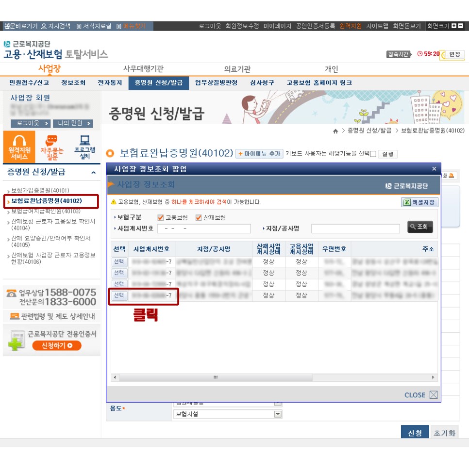 사업장 관리번호 "사업자등록번호 + 6"으로된 항목을 [선택]합니다.
